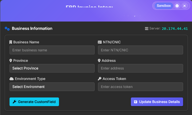 this window help us to enter Bearer Token and we can post Invoices in Sandbox Environment. when we clear our all Scenario we get Production Environment Code through this we can post real time invoice to FBR.