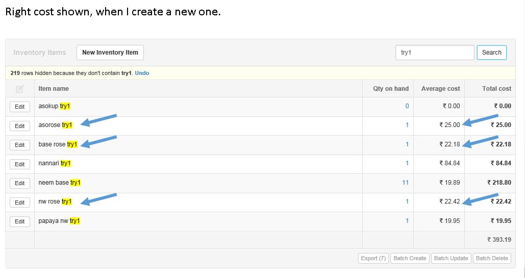 Beyond this, it is not possible to tell whether you have any problem or not, because you have not shown the complete purchase and production history of the items involved. Average cost is calculated based on every purchase invoice, payment, or production order you have ever entered for a particular inventory item. It can change frequently. Based on what you presented in your first post, the average costs look correct. But it is impossible to diagnose problems because you are obviously editing things or entering transactions between posts (such as the “try 1” additions to inventory item names).