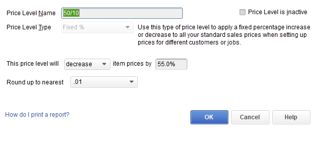 Fixed percentage price levels let you increase or decrease prices of all items for a particular customer or job by a fixed percentage. For example, you might use a fixed percentage price level for a customer who gets a 10% discount on all the products and services you offer. You can choose to round sales prices up to the next whole dollar by setting this Company preference when you use fixed percentage price levels.