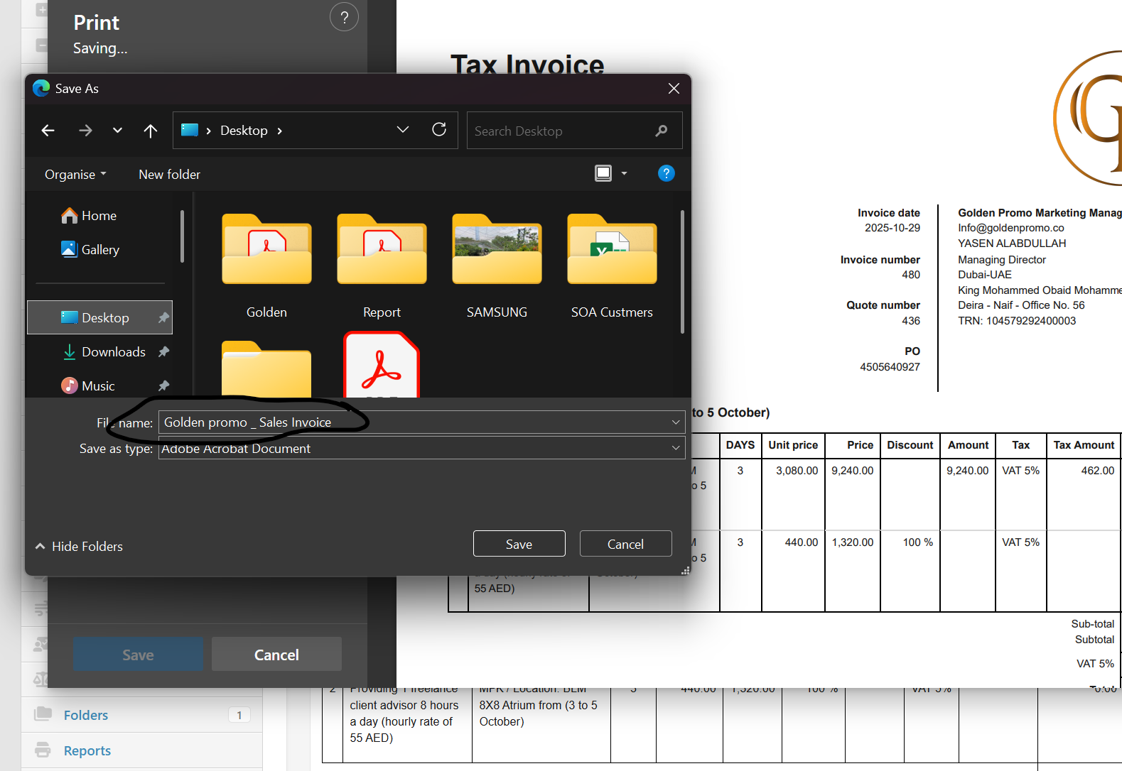 Before, when I printed an invoice or quotation, the file name automatically included the invoice number and company name — which was great. But now, it only saves as the company name and the word “Invoice,” without the number. I need a quick fix, please